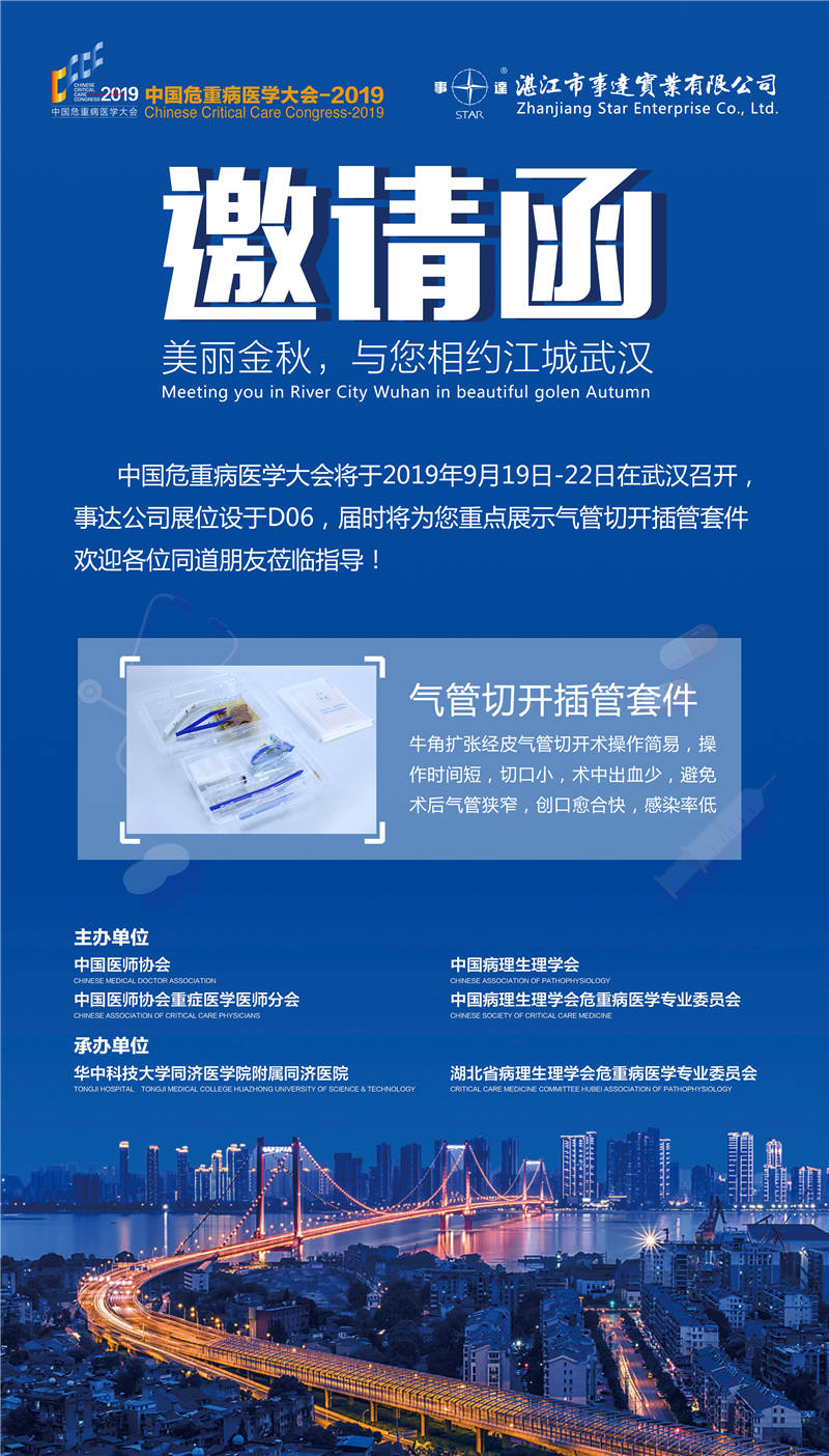 由中國醫(yī)師協(xié)會、中國醫(yī)師協(xié)會重癥醫(yī)學醫(yī)師分會、中國病理生理學會、中國病理生理學會危重病醫(yī)學專業(yè)委員會共同主辦,華中科技大學同濟醫(yī)學院附屬同濟醫(yī)院承辦的“中國危重病醫(yī)學大會(CCCC2019)”將于 2019 年 9 月19 日 -22 日在武漢召開。2009 年 7 月中國醫(yī)師協(xié)會重癥醫(yī)學醫(yī)師分會在濟南成立。2009-2019,十年風雨歷程,十個春華秋實。分會自成立以來,秉承“規(guī)范行業(yè)行為,維權自律并重”的宗旨,與中國病理生理學會危重病醫(yī)學專業(yè)委員會共同致力于建立重癥醫(yī)學培訓體系,普及重癥醫(yī)學知識與技能,加強學科人才隊伍建設,促進重癥醫(yī)學持續(xù)健康發(fā)展,推動重癥醫(yī)學領域改革與創(chuàng)新。