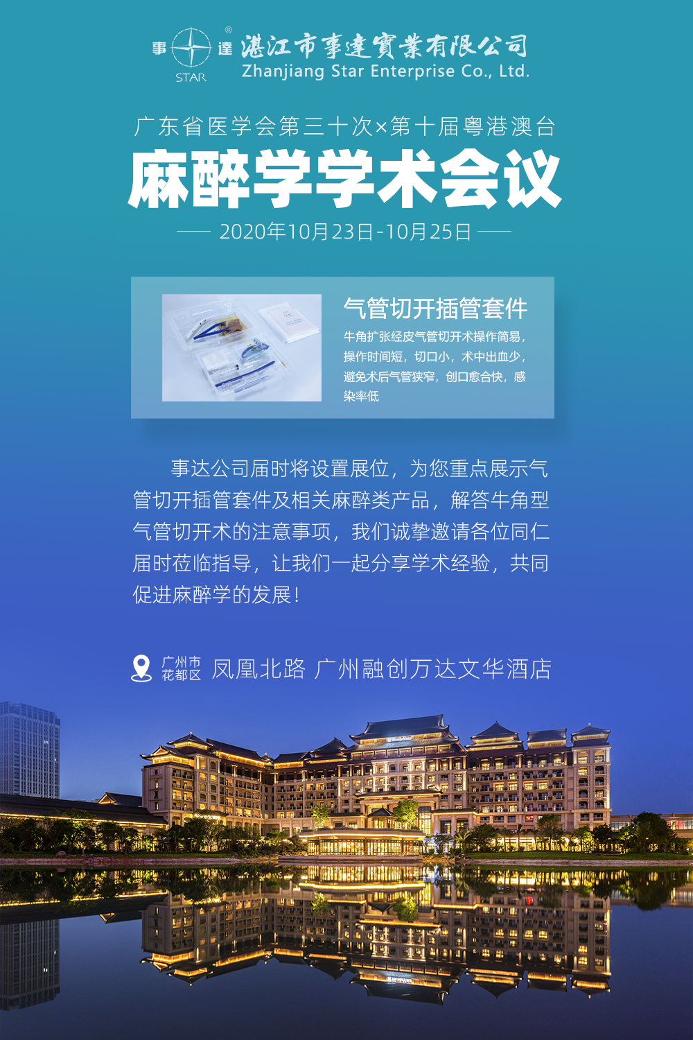 事達(dá)公司屆時將設(shè)置展位,為您重點展示氣管切開插管套件及相關(guān)麻醉類產(chǎn)品,解答牛角型氣管切開術(shù)的注意事項,我們誠摯邀請各位同仁屆時蒞臨指導(dǎo),讓我們一起分享學(xué)術(shù)經(jīng)驗,共同促進(jìn)麻醉學(xué)的發(fā)展!